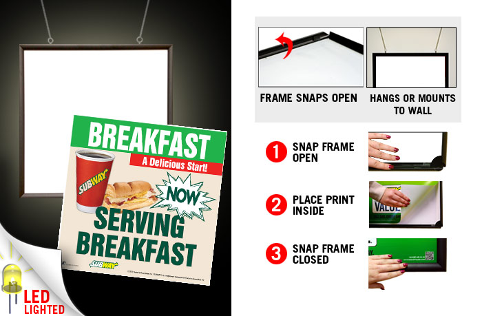 24" x 24" LED Snap Frame with Print - "Now Serving Breakfast" Lighted Sign