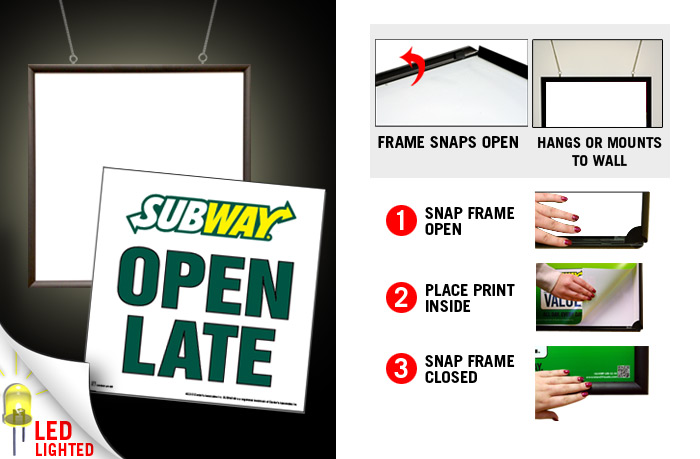 34" x 34" LED Snap Frame with Print - "Open Late" (White) Lighted Sign