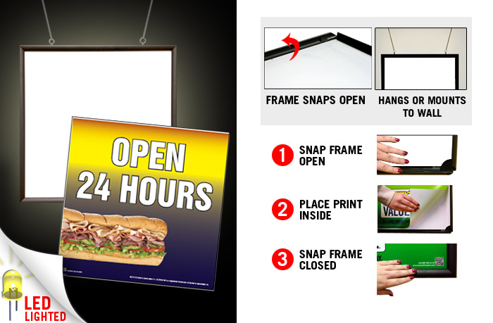 34" x 34" LED Snap Frame with Print - "Open 24 Hours" (Night & Day) Lighted Sign