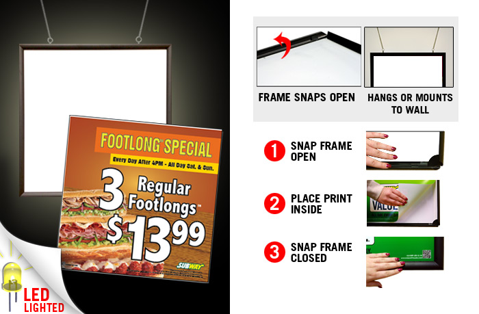 34" x 34" LED Snap Frame with Print - "3 Regular Footlong Subs for $13.99" Lighted Sign