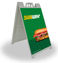 Folding 30 tall white plastic frame with subway logo andGrand Opening message. Double sided outdoor sign.